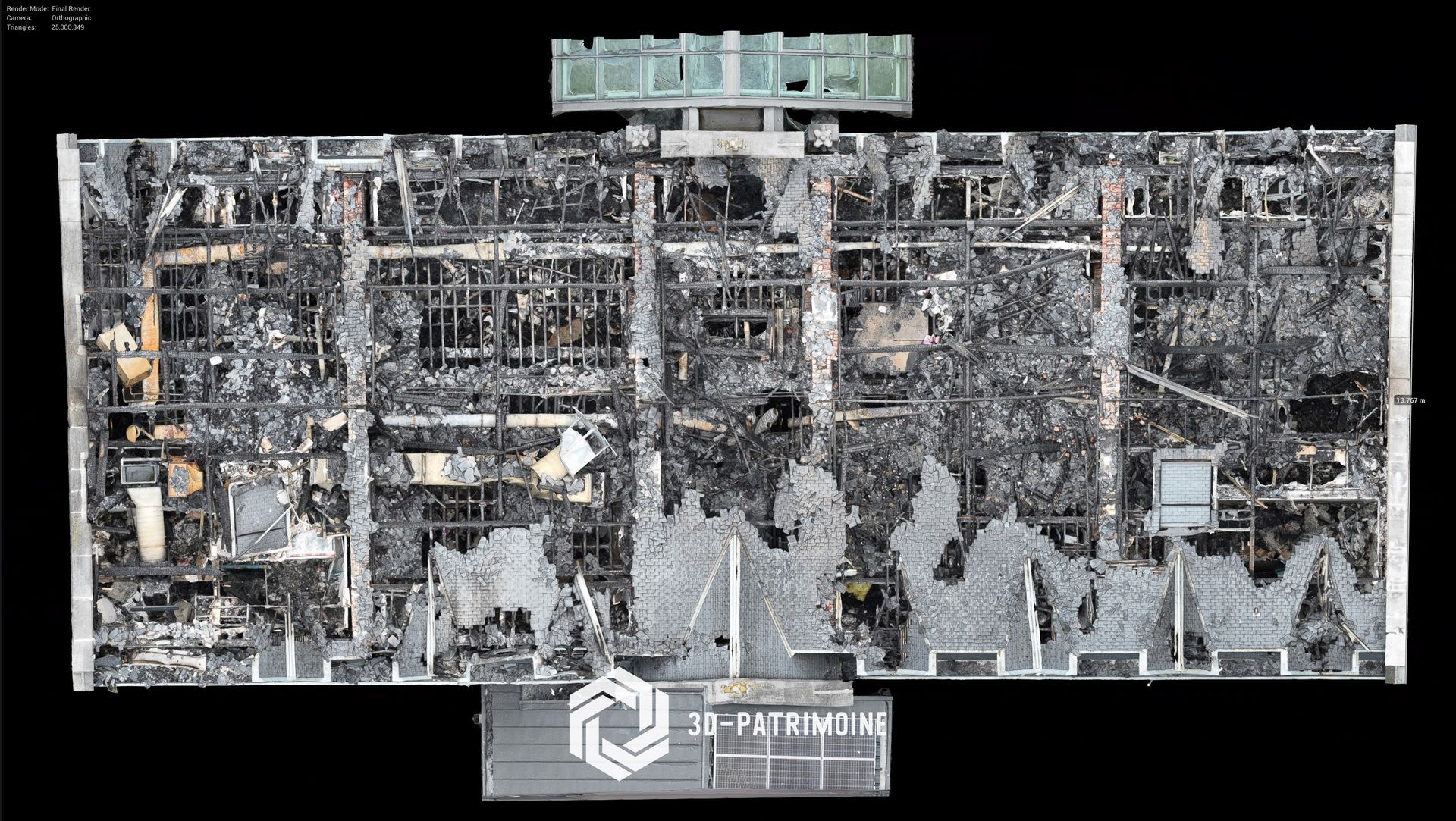 L'intervention s’est déroulée sur une demie journée, dans des conditions de sécurité optimale (exclusion des tiers). Le résultat est un support de visualisation fourni dans les 24 heures et accessible à tous les acteurs impliqués dans et après cet incident. Les données ont également servies, plus tard, aux charpentiers MH et aux architectes pour la réalisation des plans de la future charpente.