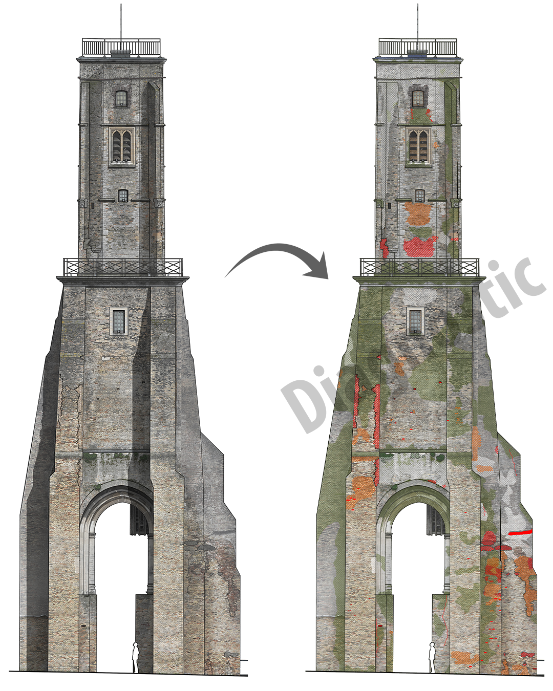 Haute de de 39 mètres, cette tour est l'une des constructions les plus anciennes de calais. Dans le cadre de sa restauration, nous avons été amenés à modéliser l'intérieur et l'extérieur de celle-ci. Cette modélisation nous a permis de créer des diverses orthophotographies, facilitant grandement le travail des architectes.