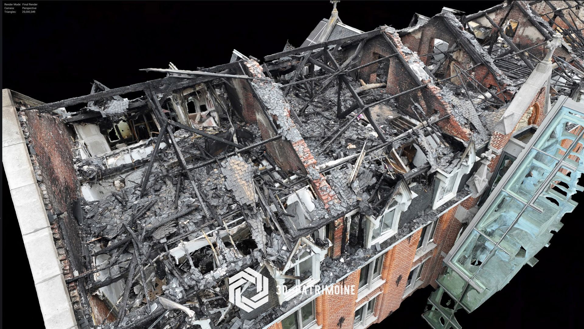 Après l'incendie de la toiture d'un bâtiment dépendant de l'Université Catholique de Lille en Mai 2023, nous sommes intervenus pour réaliser un relevé photogrammétrique des décombres.